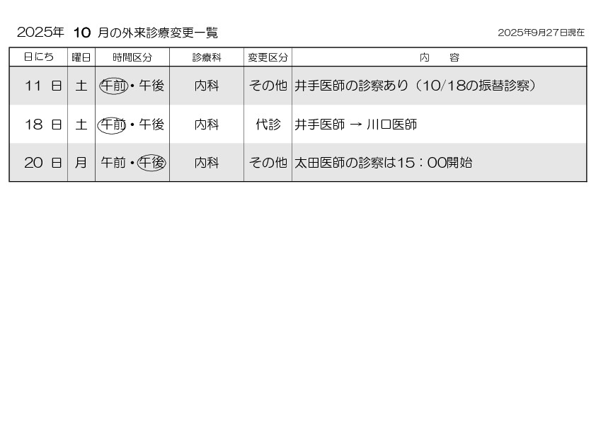 2025.9.29 【外来】2025年10月休診・代診のお知らせ外来の休診・医師変更についてお知らせいたします。 急な休診・代診はお知らせに掲載できない場…