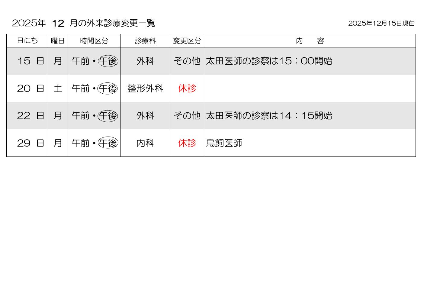 2025.12.17 【外来】2025年12月休診・代診のお知らせ